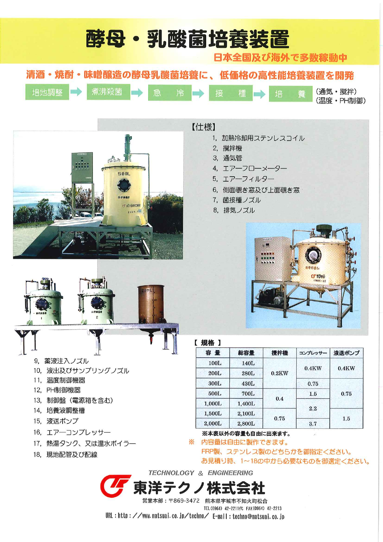 ・日本全国及び海外で多数稼動中・清酒・焼酎・味噌醸造の酵母乳酸菌培養に、低価格の高性能培養装置を開発・培地調整→煮沸殺菌→急冷→接種→培養(通気・撹拌)(温度・PH制御)