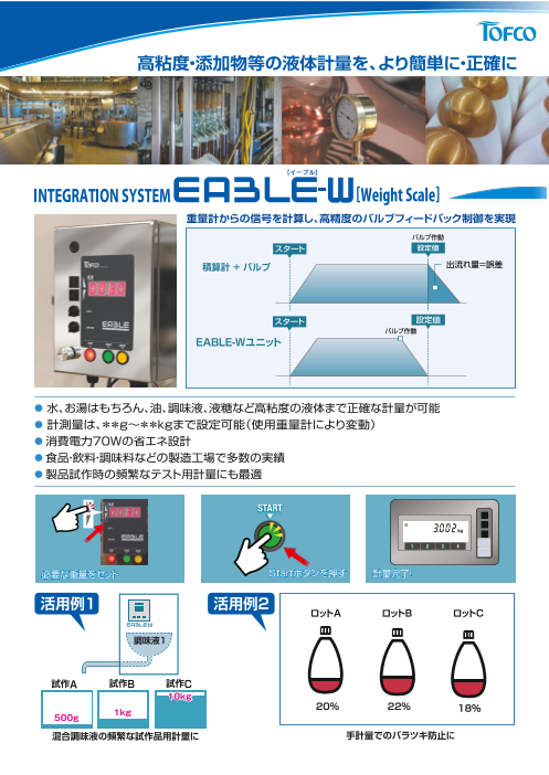 流量計とバルブで構成され、設定した積算流量でバルブを閉じ、投入量(積算量)を管理できます。食品の調合時、例えばドレッシングの調合の場合、水、植物油、醤油、お酢、食品...