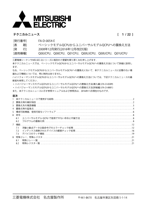 掲載内容◆[適用機種] Q00JCPU,Q00CPU,Q01CPU,Q00UJCPU,Q00UCPU,Q01UCPU◆本テクニカルニュースで使用する総称◆置換え時の検討項目◆置換え先の推奨機種◆ 置換え時...