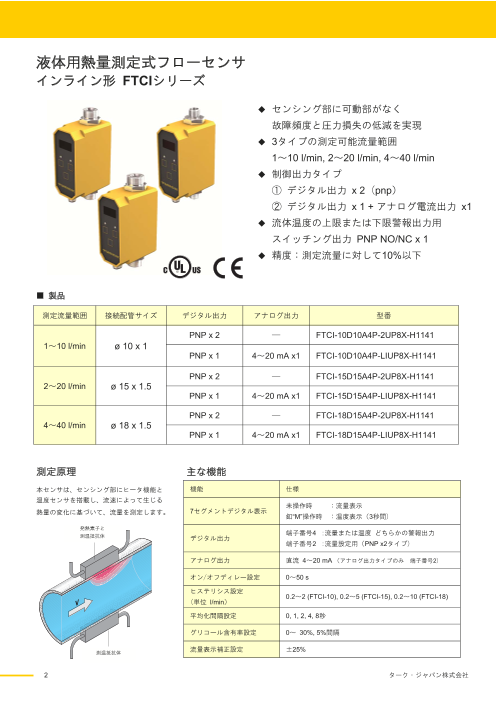 ◆3タイプの測定可能流量範囲1~10 l/min, 2~20 l/min, 4~40 l/min◆制御出力タイプ①デジタル出力 x 2 (pnp)②デジタル出力 x 1 + アナログ電流出力 x1◆流体温度の上...