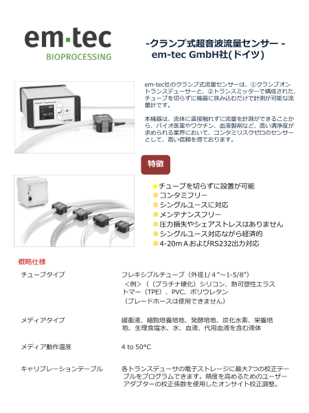 em-tec社のクランプ式流量センサーは、クランプオントランスデューサーと、トランス...