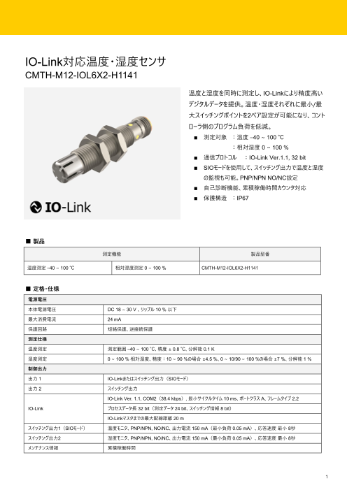 温度と湿度を同時に測定し、IO-Linkにより精度⾼いデジタルデータを提供