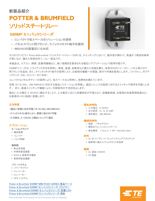 TEコネクティビティ Potter&Brumfield ソリッドステートリレー(SSR)は、スイッチ...