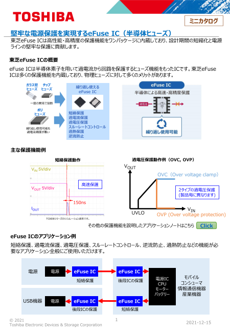 eFuse ICは半導体素子を用いて過電流から回路を保護するヒューズ機能をもったICです。東芝eFuseICは多くの保護機能を内蔵しており、物理ヒューズに対して多くのメリットがあ...