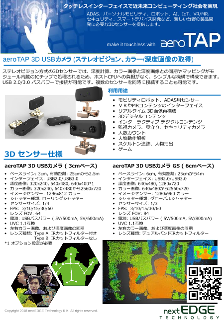 aeroTAP(エアロタップ)は情報端末のタッチレス化を支援します。ステレオビジョン方式の3Dセンサーでは、深度計算、カラー画像と深度画像との同期とマッピング処理がICチップ内...