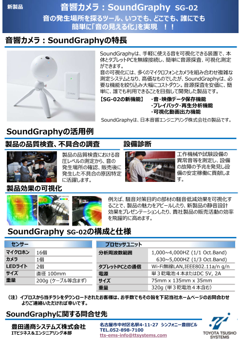 SoundGraphyは、手軽に使える音を可視化できる装置で、10cmの球体の測定器とコントローラをタブレットPCと無線接続し、簡単に音源探査、可視化測定ができます。このSoundGraphy...