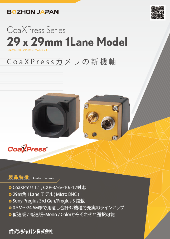 SONY製Pregius 3rdGen / PregiusS (4thGen)シリーズセンサーを搭載した29mm角 1Laneカメラシリーズ。Normal Speedセンサーを搭載したスタンダードモデルとHigh Speedセンサ...
