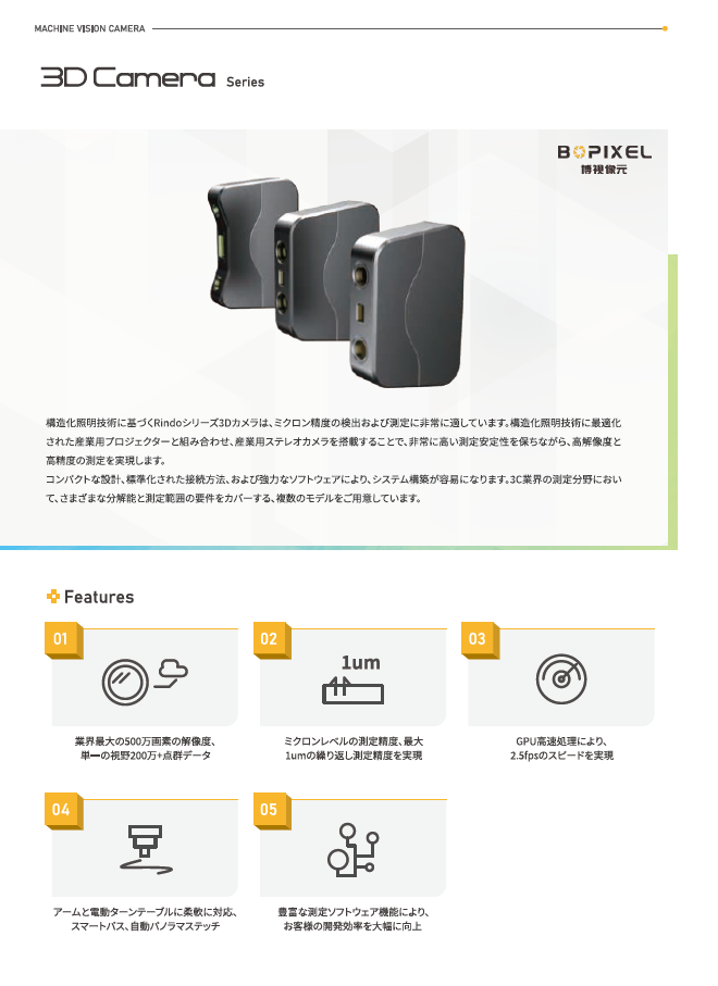 構造化照明技術に基づくRindosシリーズ 3Dカメラは、ミクロン精度の検出および測定に非常に適したカメラです。構造化照明技術に最適化された産業用プロジェクターと組み合わ...
