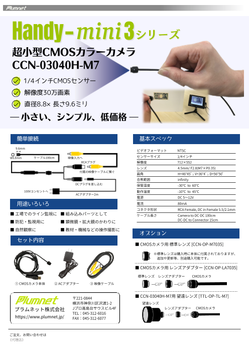 ◆1/4インチCMOSセンサー◆解像度30万画素◆直径8.8×長さ9.6ミリ◆小さい、シンプル、低価格 ◆詳細はカタログをダウンロードしご覧いただくか、お気軽にお問い合わせ下さい。