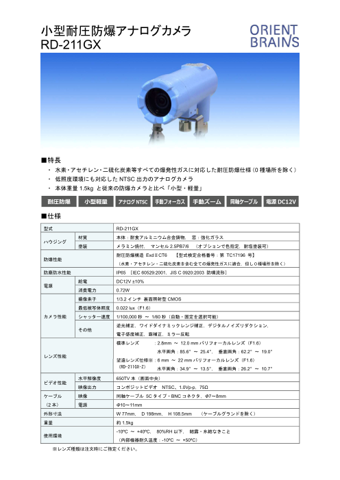 ◆水素・アセチレン・二硫化炭素等すべての爆発性ガスに対応した耐圧防爆仕様0(0種場所を除く)◆低照度環境にも対応したNTSC出力のアナログカメラ◆本体重量1.5kg◆詳細は...
