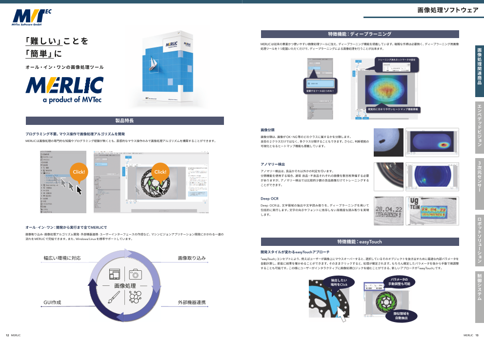 MERLICは難しいプログラミングなしでマシンビジョン用画像処理アプリケーションを構築することができる、オールインワンのソフトウェアパッケージです。○GUI構築機能○自由...