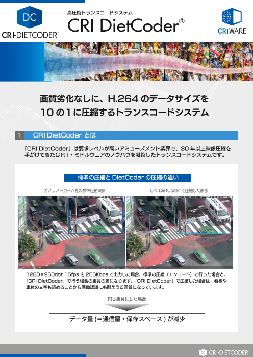 「CRI DietCoder」は要求レベルが高いアミューズメント業界で、30年以上映像圧縮を手がけてきたCRI・ミドルウェアのノウハウを凝縮したトランスコードシステムです。このソ...