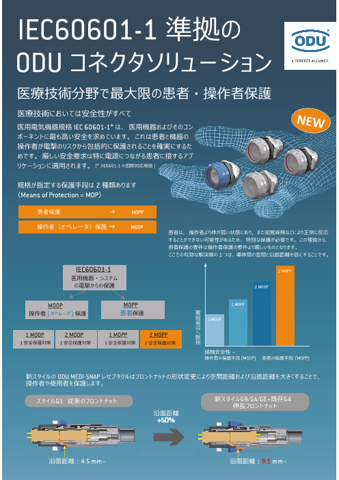 本フライヤーでは、IEC60601-1準拠の新製品のODUコネクタをご紹介しています。新スタイルのODU MEDI-SNAP レセプタクルはフロントナットの形状変更により空間距離および沿...