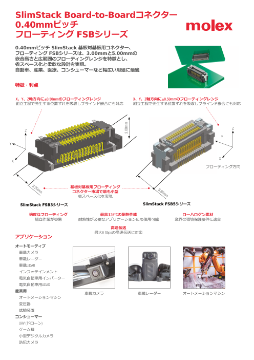 0.40mmピッチ SlimStack 基板対基板用コネクター、フローティング FSBシリーズは、3.00mmと5.00mmの嵌合高さと広範囲のフローティングレンジを特徴とし、省スペース化と柔軟な設...