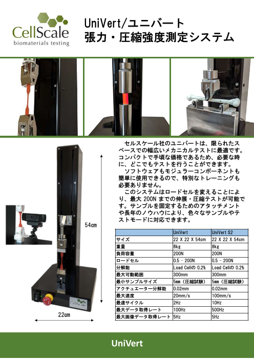 1台で引張、圧縮、3点曲げ試験が可能な卓上試験機です。データと同期する画像の取得も可能で、オプションで液中測定(縦向き、横向き)も可能です。・ロードセル:0.5~200N...