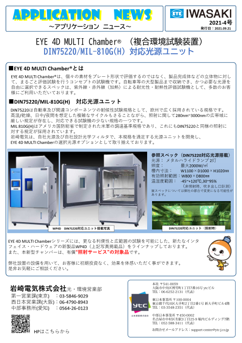 複合環境試験装置『EYE 4D MULTI Chamber』に、DIN75220およびMIL-810G(H)対応光源ユニットをラインナップ。海外市場への進出をご検討の皆様、有償”照射サービス”も活用いただ...