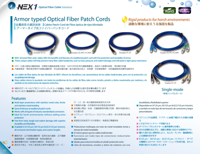 NEX1のアーマータイプ(Armor Type)光ファイバーパッチコードは、外装による保護力と...