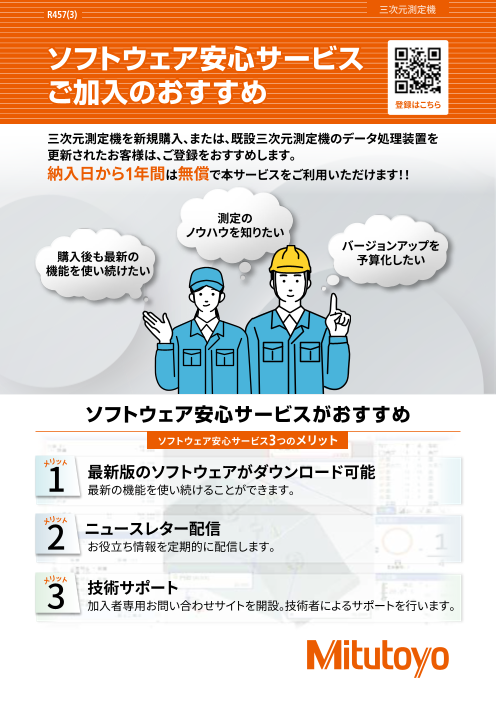 三次元測定機を新規購入、または、既設三次元測定機のデータ処理装置を更新されたお客様は、ご登録をおすすめします。納入日から1年間は無償で本サービスをご利用いただけます!!ソフトウェア安心サービス3つのメリット・最新版のソフトウェアがダウンロ...