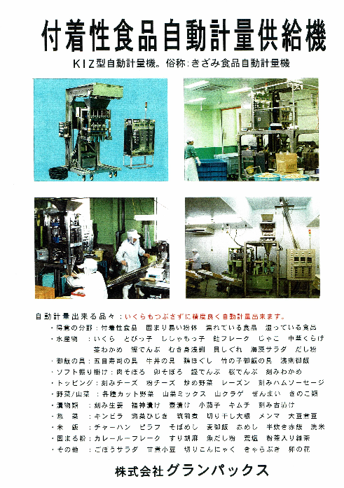 ・濡れた物、湿った物の自動計量機です・テフロン樹脂の送り羽根で具材を送ります・簡単操作で無人で自動計量を行います・マイナス計量無しで排出途中の付着も殆ど有りま...