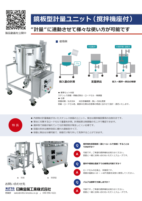 重量計測機能が付いたステンレス容器です。架台は撹拌機設置用の台座付き。別売りの撹拌機と一緒に使用すれば、原料の計量~撹拌をこれ一台で完了できます。 重量と連動...