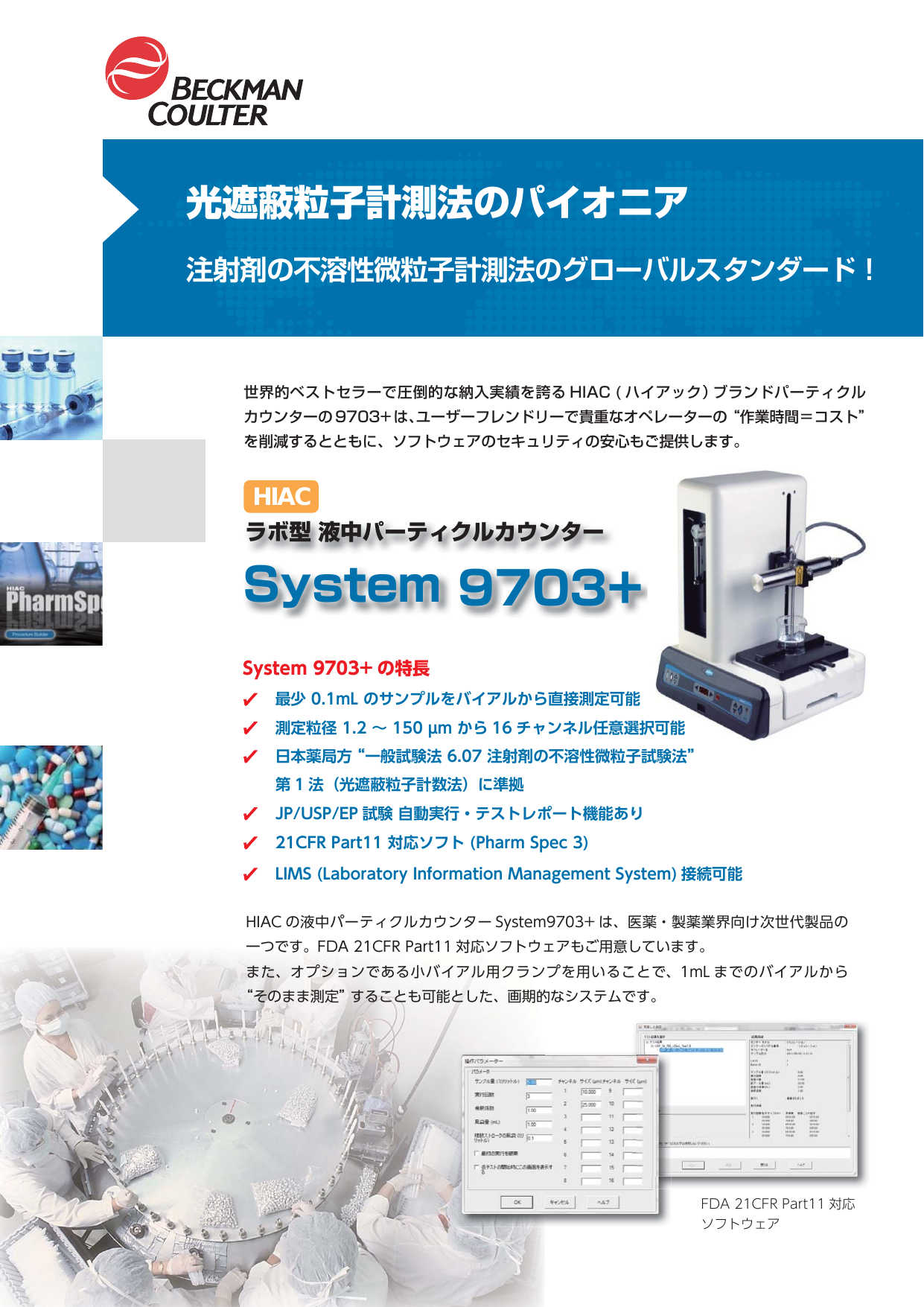 【特徴】○最少 0.1mL のサンプルをバイアルから直接測定可能○測定粒径 1.2〜150 μm から 16 チャンネル任意選択可能○日本薬局方 一般試験法 6.07 注射剤の不溶性微粒...