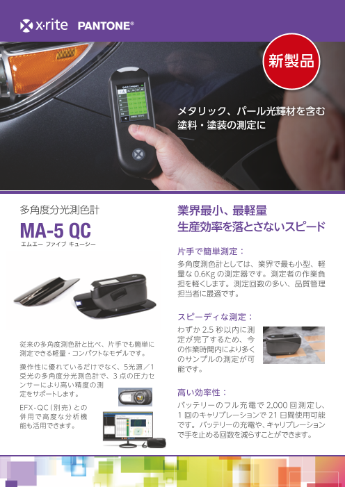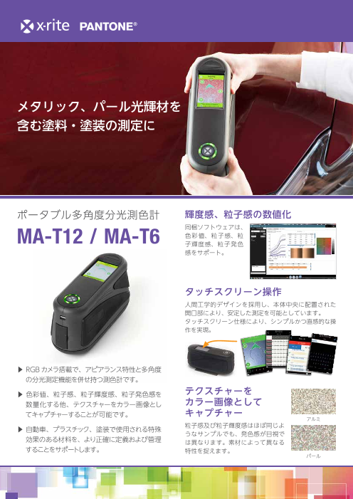 【製品特長】・小型・軽量のマルチアングル(6角度)分光測色計・新技術 "ダブルパス光学系"を搭載、測定安定性及び光輝材、シボなど表面特性の評価が可能です。・小面積に...
