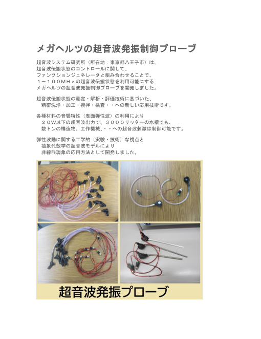 超音波システム研究所は、 *超音波の発振制御技術(オリジナル製品:超音波発振制御プローブ) *超音波伝搬状態の測定技術(オリジナル製品:超音波テスター) *超...
