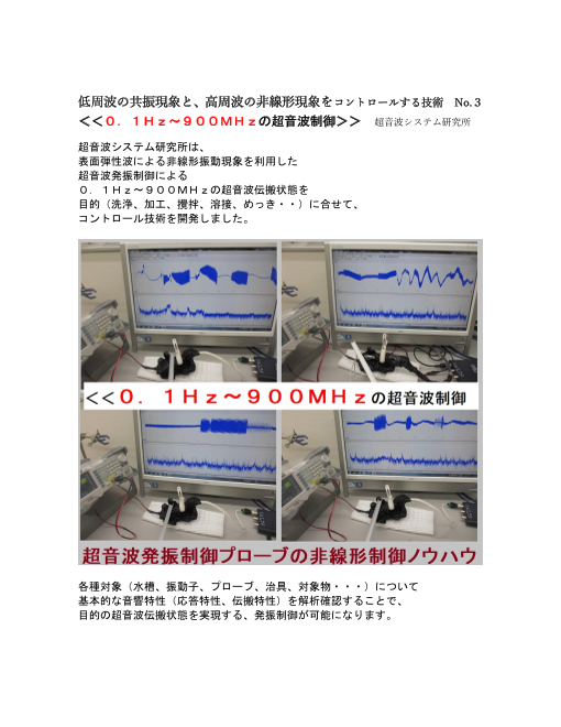 超音波システム研究所は、表面弾性波による非線形振動現象を利用した超音波発振制御による0.1Hz~900MHzの超音波伝搬状態を目的(洗浄、加工、攪拌、溶接、...