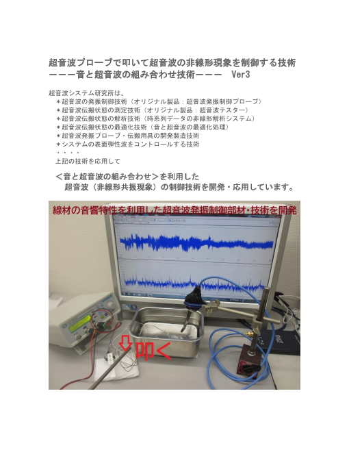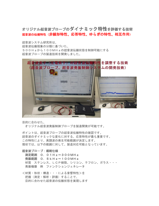 オリジナル非線形共振現象についてメガヘルツの超音波発振制御と表面弾性波を最適化する技術超音波システム研究所は、 超音波発振制御プローブを発振することで発生す...