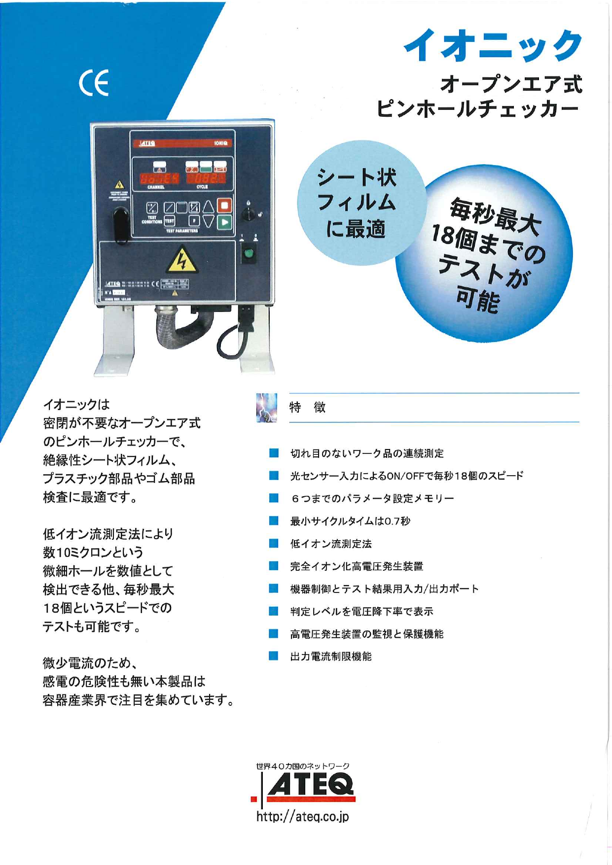 イオニックは密閉が不要なオープンエア式のピンホールチェッカーで、絶縁性シート状フィルム、プラスチック部品やゴム部品検査に最適です。低イオン流測定法により数10ミクロ...