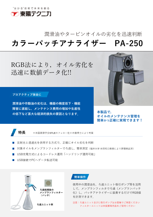潤滑油やタービンオイルの劣化を迅速判断特長:・反射光と透過光を併用する方式で、正確にオイル劣化を判断・対象オイルをメンブランフィルターでろ過し、簡単測定(福...