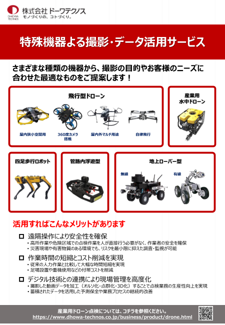 <ドローン活用メリット>■遠隔操作により安全性を確保• 高所作業や危険区域での点検作業を人が直接行う必要がなく、作業者の安全を確保• 災害現場や有害物質のある環境で...
