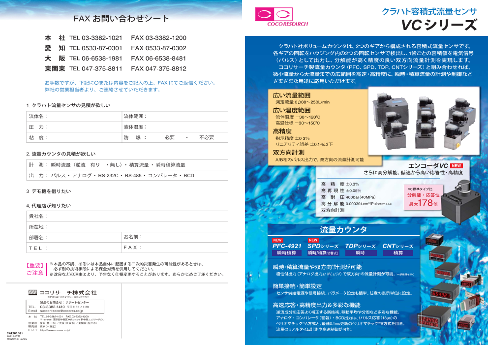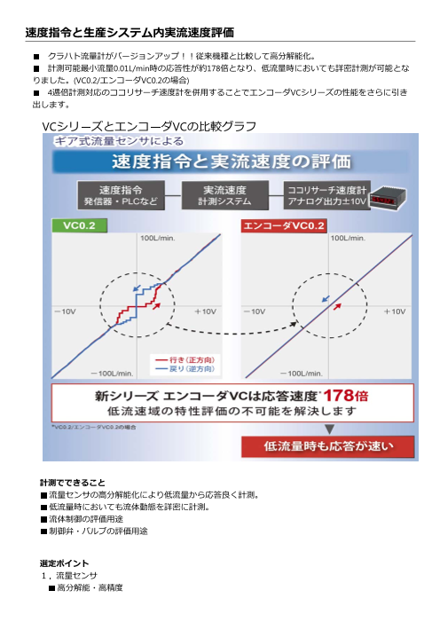 ■ クラハト流量計がバージョンアップ!!従来機種と比較して高分解能化。■ 計測可能最小流量0.01L/min時の応答性が約178倍、低流量時も詳密計測(VC0.2/エンコーダVC0.2の場合)■ 4逓倍計測対応のココリサーチ速度計を併用することでエンコーダVCシリーズの性能を...