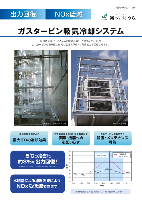 ◆水の蒸発潜熱による最大6℃の冷却効果◆外気温湿度に基づいた自動運転で手間・機器への心配いらず◆ガスタービン運転中でも設置・メンテナンス可能◆5℃の冷却で約3%の出力回...