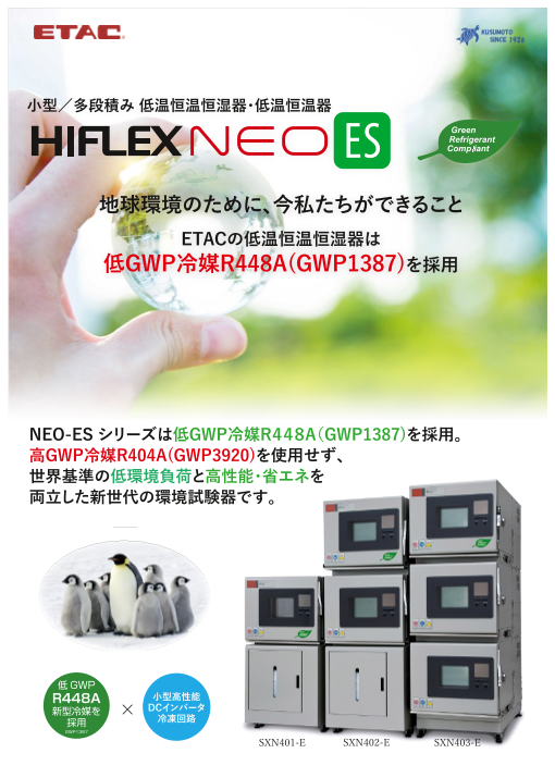 NEO-ES シリーズは低GWP冷媒R448A(GWP1387)を採用。 高GWP冷媒R404A(GWP3920)を使用せず、 世界基準の低環境負荷と高性能・省エネを 両立した新世代の環境試験器です。...