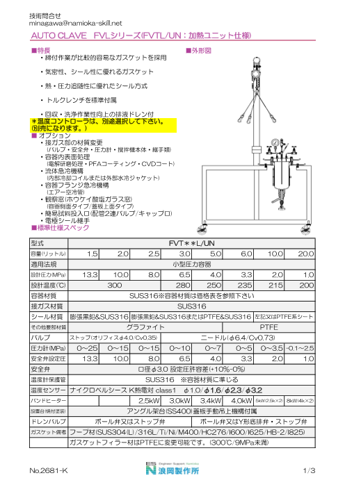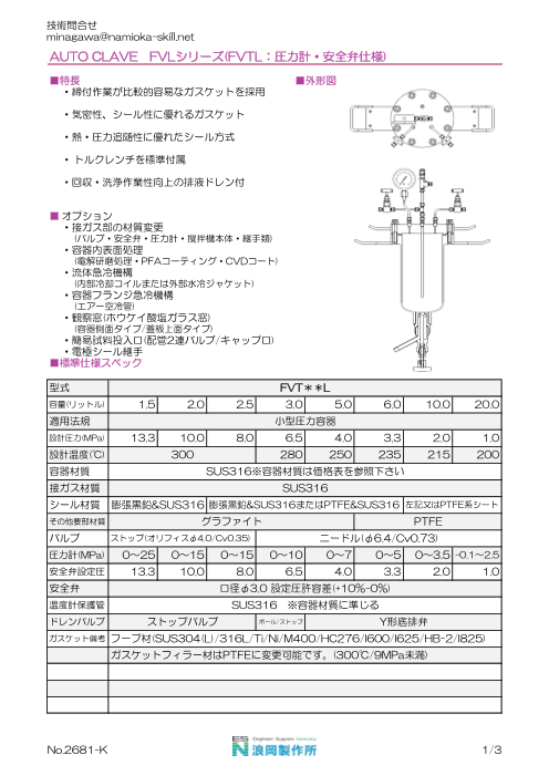【FVLシリーズ】『FVTL』はオートクレーブ(反応器)です。うずまきガスケットによるシール方式で、フランジとの馴染みが良く高温・高圧シールに適しています。メタルガスケッ...