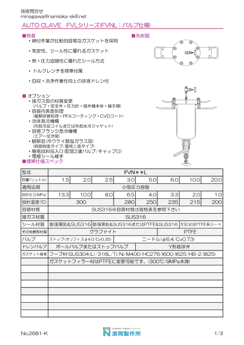 【FVLシリーズ】『FVNL』はオートクレーブ(反応器)です。うずまきガスケットによるシール方式で、フランジとの馴染みが良く高温・高圧シールに適しています。メタルガスケッ...