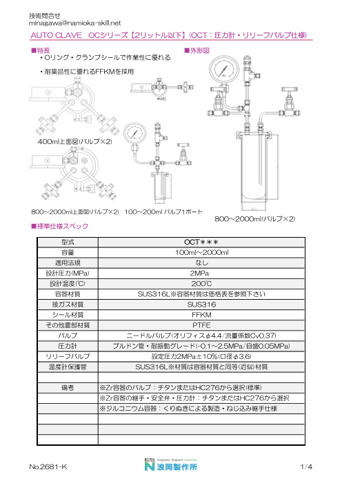 【OCシリーズ】『OCT』はオートクレーブ(反応器)です。Oリング&クランプによるシール方式です。耐薬品性に優れるFFKMを採用し、クランプシールで作業性に優れます。■容量は1...