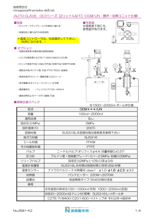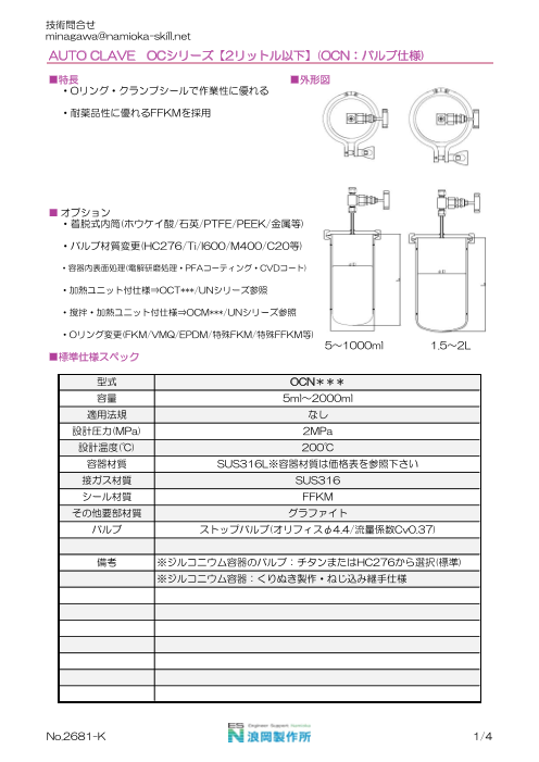 【OCシリーズ】『OCN』はオートクレーブ(反応器)です。Oリング&クランプによるシール方式です。耐薬品性に優れるFFKMを採用し、クランプシールで作業性に優れます。■容量は5...