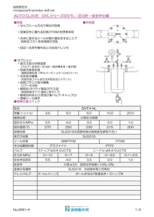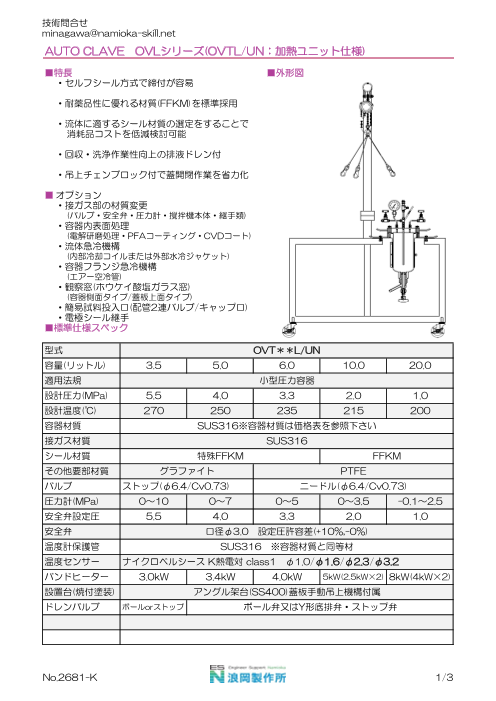 【OVLシリーズ】『OVTL/UN』は静置式オートクレーブユニットです。Oリング&ボルトによるシール方式です。セルフシールのため、ボルトの締付作業も容易です。■容量は3.5リッ...