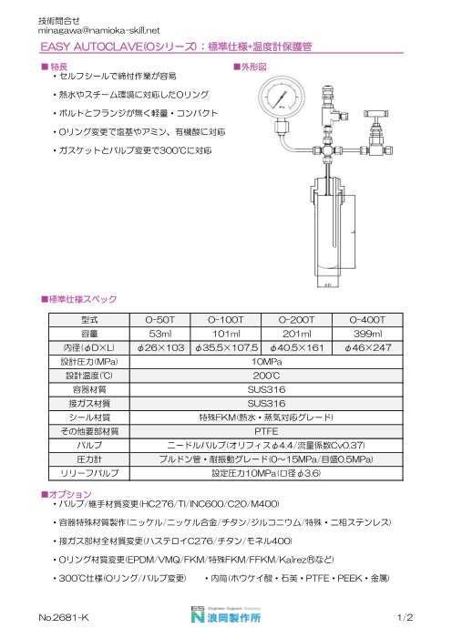 【Oシリーズ】『O-T』はオートクレーブ(反応器)です。Oリング&キャップによるシール方式です。耐水蒸気に優れる三元FKMを採用し、Oリングで200℃仕様対応です。セルフシールの...