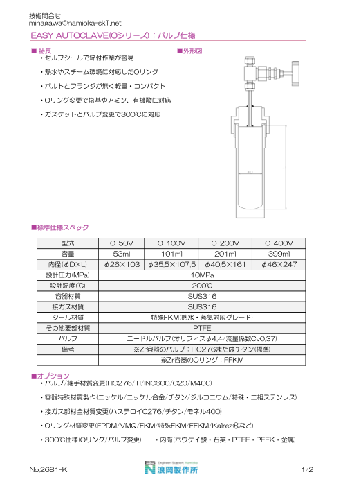 【Oシリーズ】『O-V』はオートクレーブ(反応器)で、Oリング&キャップによるシール方式です。耐水蒸気に優れる三元FKMを採用し、Oリングで200℃仕様対応です。セルフシールのた...