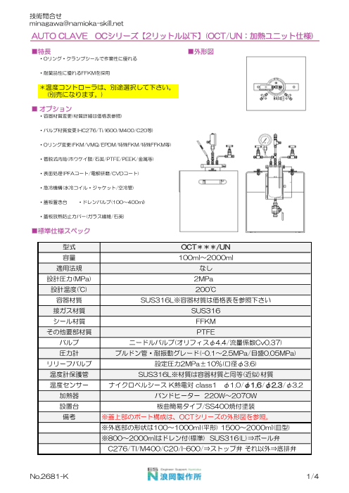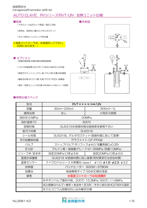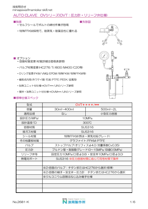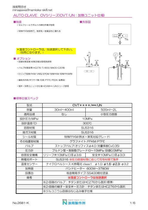 【OVシリーズ】『OVT/UN』は静置式オートクレーブユニットです。Oリング&ボルトによるシール方式です。■容量は30ミリリットルから2リットルまで標準対応しています。設計容...