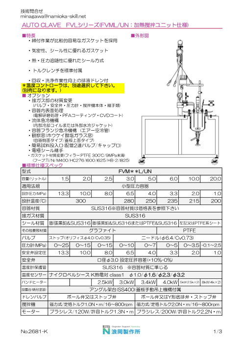 【FVLシリーズ】『FVML/UN』は撹拌付オートクレーブユニットです。うずまきガスケットによるシール方式で、フランジとの馴染みが良く高温・高圧シールに適しています。メタ...