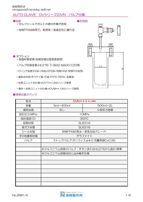 【OVシリーズ】『OVN』はオートクレーブ(反応器)で、Oリング&ボルトによるシール方式です。耐薬品・耐熱性に優れる特殊FFKMを採用し、Oリングで300℃仕様対応です。セルフシー...