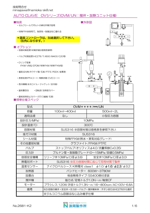 【OVシリーズ】『OVM/UN』は撹拌付オートクレーブユニットです。Oリング&ボルトによるシール方式です。耐薬品・耐熱性に優れる特殊FFKMを採用し、Oリングで300℃仕様対応です。...