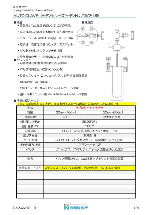【H-RVシリーズ】『H-RVN』はオートクレーブ(反応器)です。メタルガスケット&ボルトによるシール方式です。経済性、気密性に優れたデルタガスケットを採用し、ガスケットの繰...