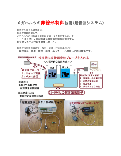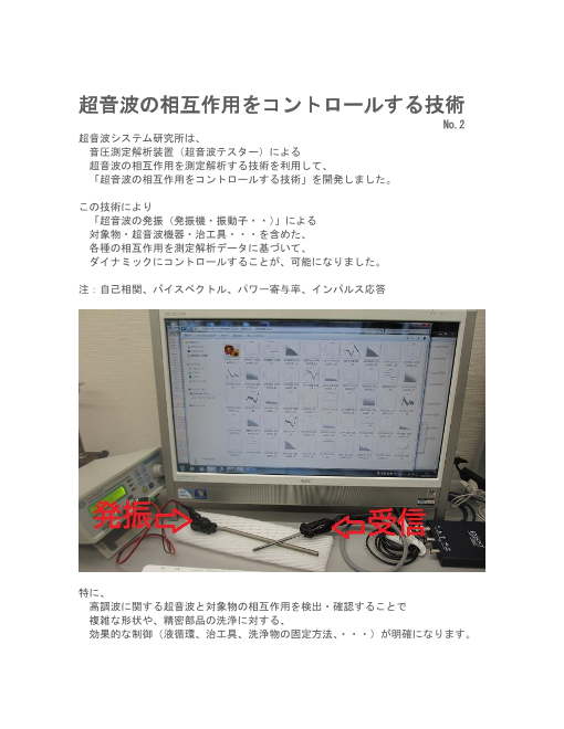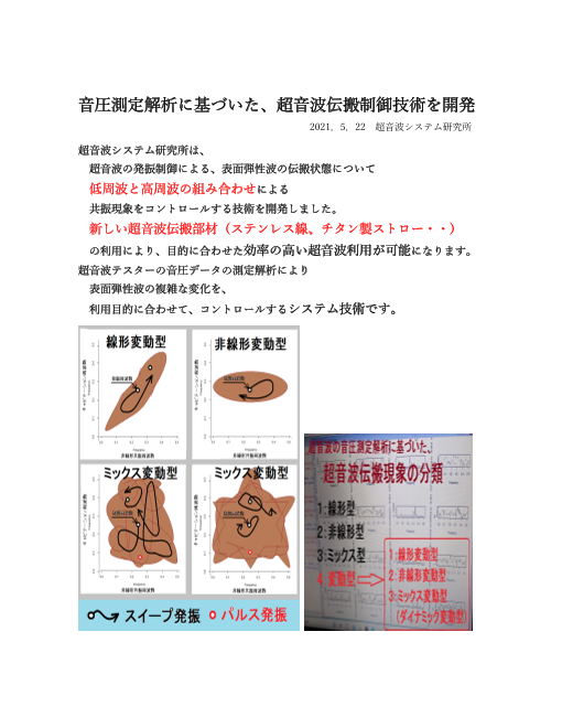 超音波システム研究所は、 音圧測定解析装置(超音波テスター)による 超音波の相互作用を測定解析する技術を利用して、 「超音波の相互作用をコントロールする技術」...
