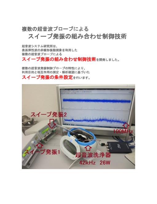 超音波システム研究所は、表面弾性波の非線形振動現象を利用した複数の超音波プローブによるスイープ発振の組み合わせ制御技術を開発しました。複数の超音波発振制御...
