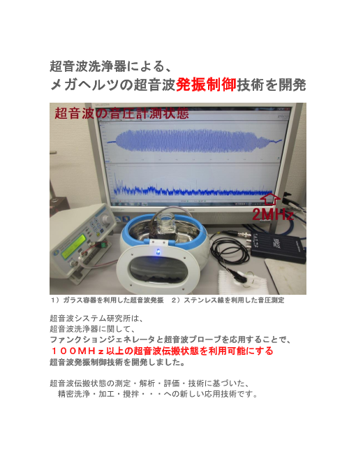 超音波システム研究所(所在地:東京都八王子市)は、超音波洗浄器に関して、ファンクションジェネレータと超音波プローブを応用することで、100MHz以上の超音波伝...